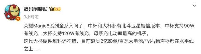 荣耀Magic8系列全系入网了,中杯和大杯都有北斗卫星短信版本,中杯支持90W有线充,大杯支持120W有线充,母系充电功率最高的机子。