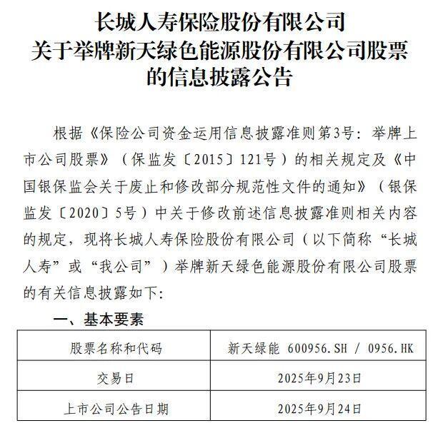 9月25日,长城人寿发布公告称,公司通过港股二级市场集中竞价交易方式增持新天绿能H股100万股,持股比例突破5%,触及举牌。