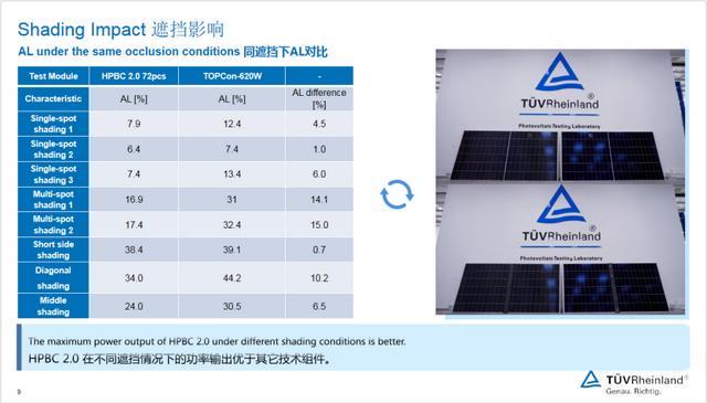 TÜV莱茵的数据证明,采用 HPBC 2.0 技术的隆基“三防”组件无论在单点遮挡、多点遮挡、斜边遮挡的情况下,功率损失均优于 TOPCon 组件,因此隆基 HPBC 2.0 的组件获得了莱茵抗阴影 A + 级认证。