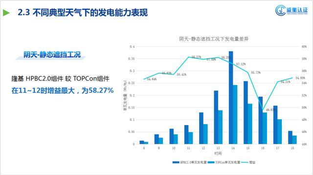 特别值得强调的是,在阴天无遮挡工况下,隆基HPBC 2.0的组件较TOPCon单瓦增益达到了1.96%,其中在16~17时增益最大,达到了4.42%。