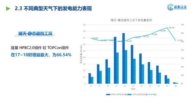 在晴天有遮挡工况下,隆基HPBC 2.0组件较TOPCon组件在17~18时增益最大,为66.54%。