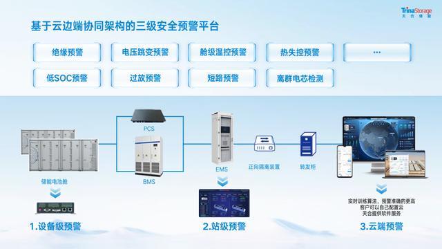 此外,天合储能构建了“云-边-端”协同的三级安全预警平台,覆盖绝缘异常、电压跳变、热失控、离群电芯等关键风险点,实现从设备级、站级到云端的立体化监控。结合AI大数据全景监测平台,可对电芯、PCS、电池舱等核心设备进行健康评估与故障预测,实现24小时动态运维,提前识别隐患并预警,有效杜绝安全风险,契合《专项行动方案》中关于“人工智能+”融合应用的要求。
