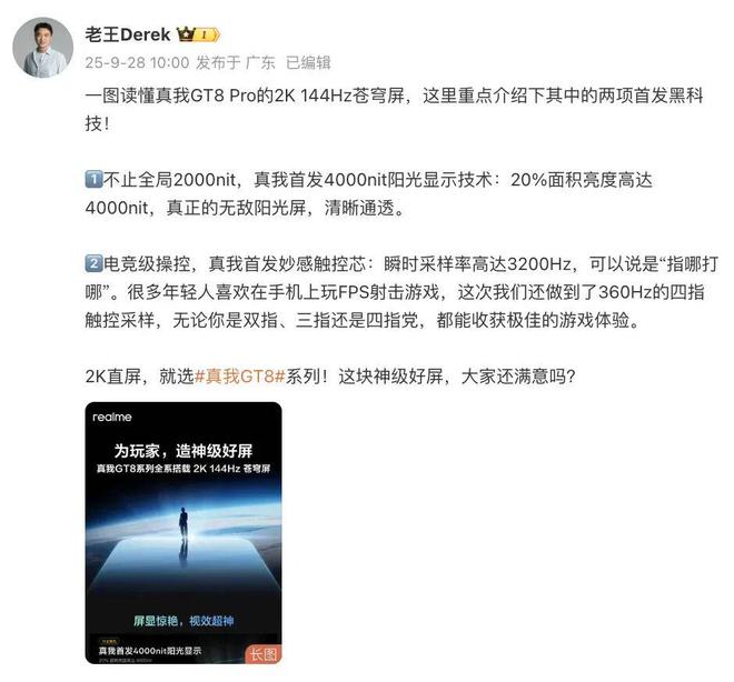 今天,真我手机宣布,真我GT8系列全系搭载2K 144Hz苍穹屏。