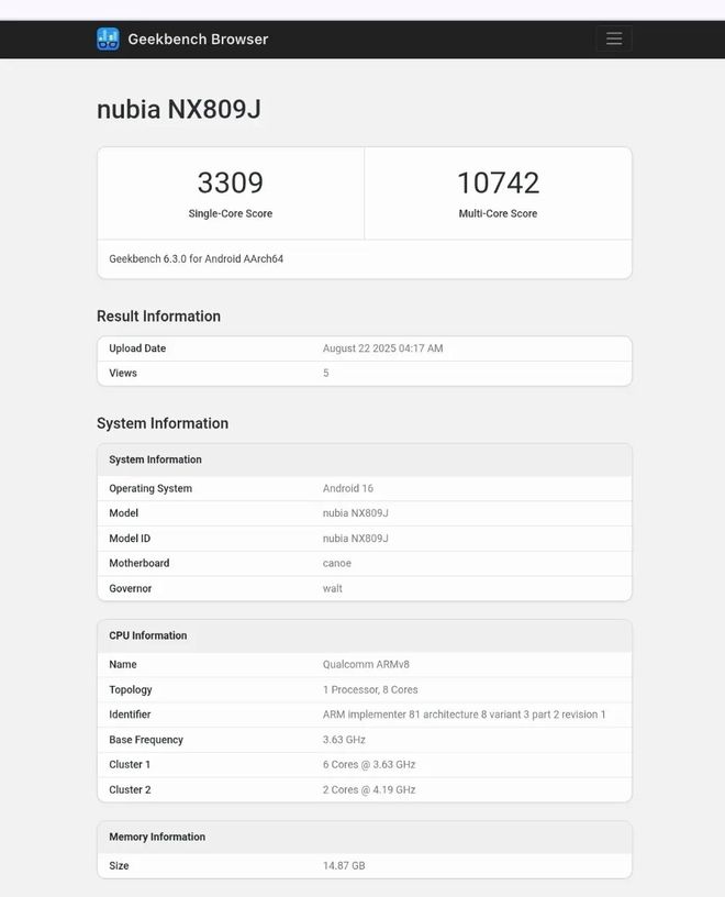 上个月,一款型号为 NX809J 的努比亚新机现身 Geekbench 跑分平台,预计为红魔 11 系列游戏手机。