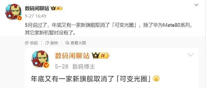 新机方面,9月27日,博主@数码闲聊站表示,华为Mate 80系列将支持可变光圈,其它国产品牌都暂时放弃了。