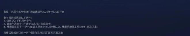 据了解,“鸿蒙有礼特别版”活动计划于2025年9月30日开启,需满足以下条件: