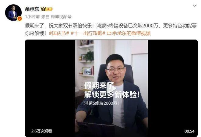 今日,华为常务董事、终端 BG 董事长余承东发布视频,祝福用户国庆和中秋双节快乐,并宣布鸿蒙 5 终端设备已突破 2000 万。