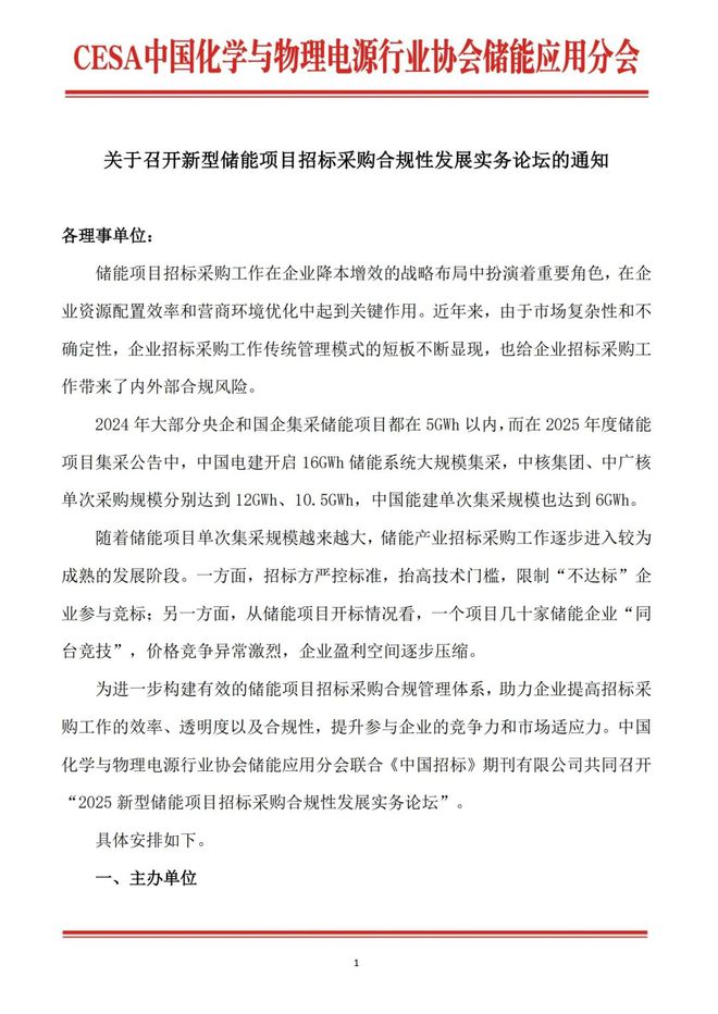 2024 年,央企国企的储能项目集采规模大多在 5GWh 以内,而到了 2025 年,行业采购格局发生显著变化。中国电建启动 16GWh 储能系统集采,中核集团、中广核分别以 12GWh、10.5GWh 的单次采购量引人注目,中国能建也达到 6GWh 集采规模。随着储能项目单次采购量不断攀升,招标采购工作正迈向成熟。当下,招标方通过严格标准、提高技术门槛,将资质不足企业挡在竞标门外;而开标现场竞争白热化,一个项目往往吸引数十家企业角逐,价格战致使企业利润空间持续收窄。为构建储能项目招标采购合规管理体系,提升招标采购效率、透明度与合规性,增强企业竞争力和市场适应性,中国化学与物理电源行业协会储能应用分会携手《中国招标》期刊有限公司,举办 “2025 新型储能项目招标采购合规性发展实务论坛” 。