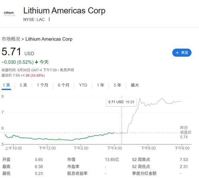 受该消息刺激,美洲锂业股价在当天盘后交易中一度飙升41%,后回落至约35%。