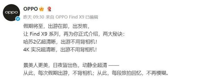 OPPO Find X9系列产品负责人周意保 此前发文 确认 , 新机 全系支持哈苏8K超清照片,可实现全焦段直出。