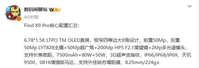 此前, 博主@数码闲聊站 曝光了OPPO Find X9 Pro的核心配置信息。
