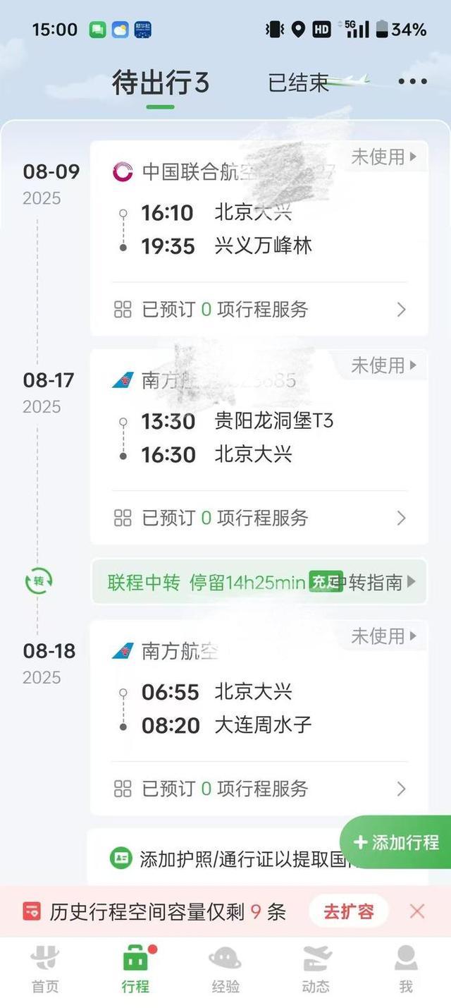 返程时,宋盈盈购买了8月17日贵阳飞大连、中转北京的机票,总价格为842元/张。她称,航班从贵阳龙洞堡机场起飞的时间是17日下午1点30分,时间点很好。当天贵阳直飞北京且起飞时间点比较好的航班,经济舱价格都在1000多元/张。