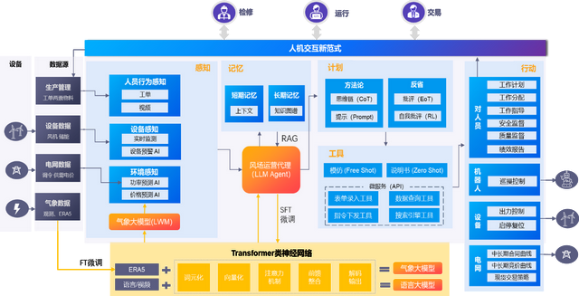 由大模型提供智力的风场智能体们,像人类一样基于感知、记忆、计划、工具管理线上世界,继而作用于物理世界,而不是像传统自动化那样,基于If else的固定规则开展行动。