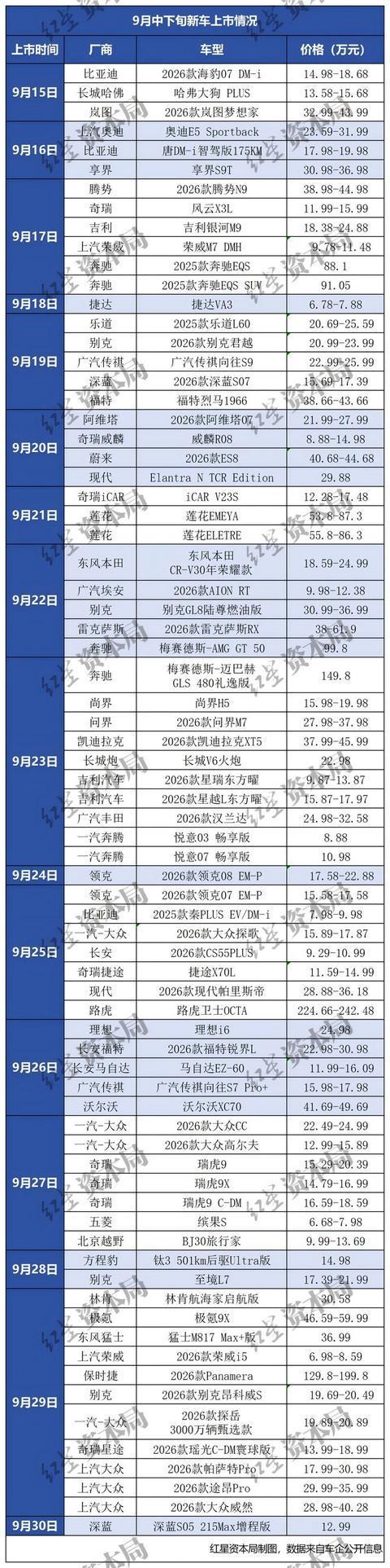 从时间节点看,这是成都车展后的常态化市场落地。从消费周期看,“金九银十”传统销售旺季与国庆假日经济形成双重利好。车企选择9月中下旬集中推新,可精准衔接假期消费高峰,提前抢占市场份额。
