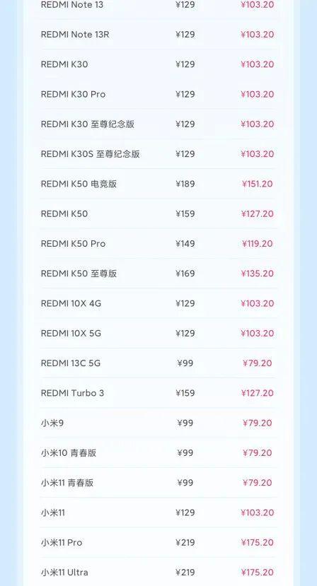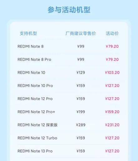 REDMI Note 8、REDMI Note 8 Pro、REDMI Note 10、REDMI Note 10 Pro、REDMI Note 12 Pro、REDMI Note 12 Pro+、REDMI Note 12 探索版、REDMI Note 12 Turbo、REDMI Note 13 Pro、REDMI Note 13、REDMI Note 13R、REDMI K30、REDMI K30 Pro、REDMI K30 至尊纪念版、REDMI K30S 至尊纪念版、REDMI K50 电竞版、REDMI K50、REDMI K50 Pro、REDMI K50 至尊版、REDMI 10X 4G、REDMI 10X 5G、REDMI 13C 5G、REDMI Turbo 3。
