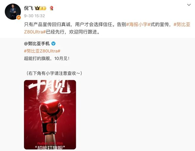 昨日,中兴通讯终端事业部总裁、努比亚技术有限公司总裁倪飞转发了这条消息,并表示“只有产品宣传回归真诚,用户才会选择信任。告别海报小字式的宣传,努比亚Z80 Ultra已经先行,欢迎同行跟进。”