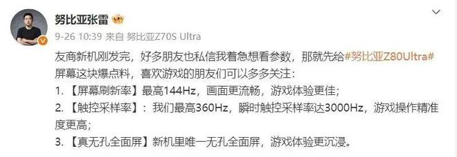 同时,努比亚Z80 Ultra屏幕刷新率最高144Hz,最高360Hz触控采样率,瞬时触控采样率达3000Hz。