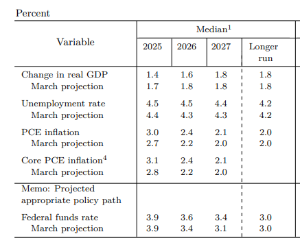 通胀方面,与会者们调高了这三年PCE和核心PCE六个数字的预测:2025、2026、2027年底PCE通胀预期中值分别为3.0%、2.4%、2.1%。(3月预期分别为2.7%、2.2%、2.0%)