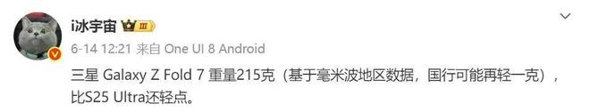 同时,参考 博主@i冰宇宙 的爆料 :“三星 Galaxy Z Fold7 重量215克(基于毫米波地区数据,国行可能再轻一克),比S25 Ultra还轻点。”