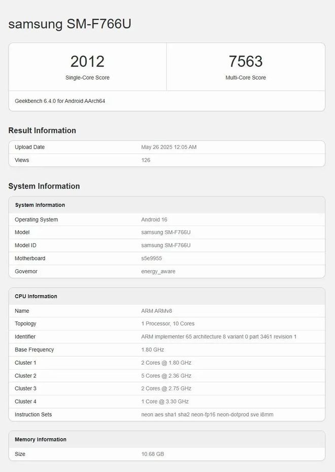 三星Galaxy Z Flip7也已经现身Geekbench跑分库,其型号为SM-F766U,在Geekbench 6.4.0版本中的单核成绩为2012分,多核成绩为7563分。