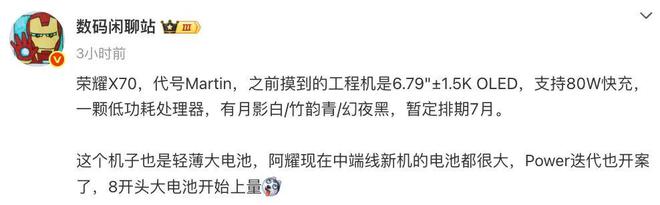 荣耀X70,代号Martin,之前摸到的工程机是6.79"±1.5K OLED,支持80W快充,一颗低功耗处理器,有月影白/竹韵青/幻夜黑,暂定排期7月。