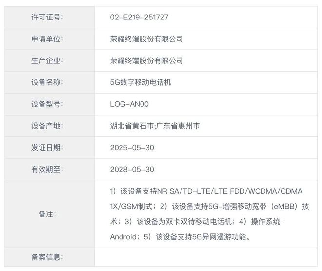 另外 ,一款型号为LOG-AN00的荣耀旗下新机于近日通过了认证。认证信息中没有显示具体的产品系列信息,但相关推测认为其有可能是荣耀畅玩 70 Plus。