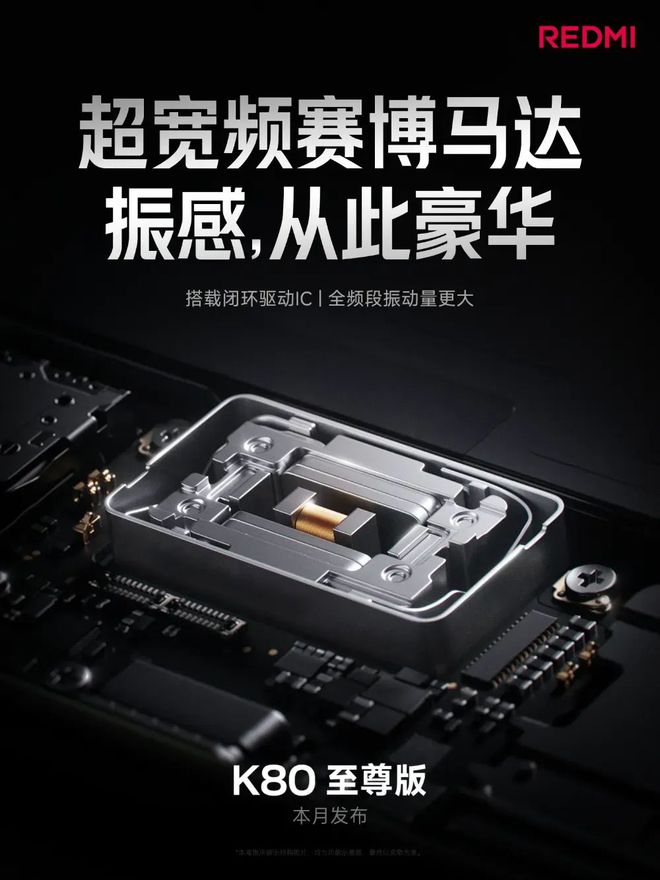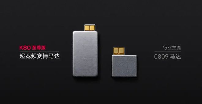 我们实拍了 K80 至尊版搭载的超宽频赛博马达,可以看到体积几乎是行业主流型号的两倍,我们还为这颗超大马达配备了独立的驱动IC,确保带来最佳的振感体验!