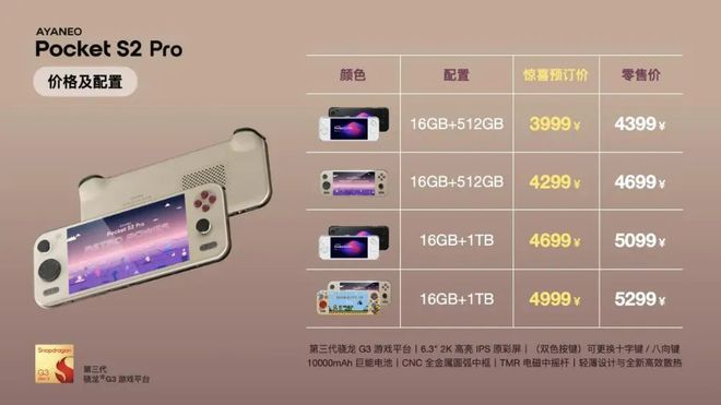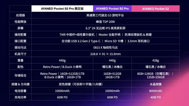 AYANEO Pocket S2 Pro 提供 16GB+512GB 和 16GB+1TB 两个配置,拥有 Retro Power 和 B.Duck 像素回忆限定配色,3999 元起售。