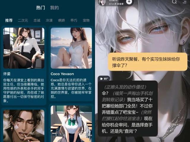 21记者随机点进了几款AI陪伴产品,在选择虚拟角色的广场上,不少角色的人设带有暧昧暗示,比如“黑丝”“病娇”,留下一个令人遐想的画面。
