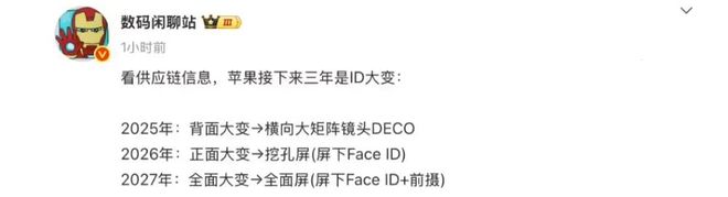 2027 年(iPhone 19 系列):全面大变 → 全面屏 (屏下 Face ID + 前摄)。