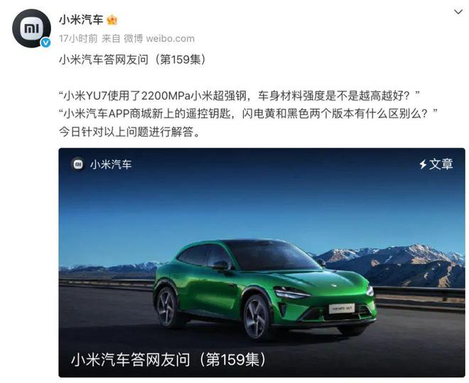 在小米汽车新一期的小米汽车答网友问中也对即将到来的小米YU7给出了更详细的介绍。