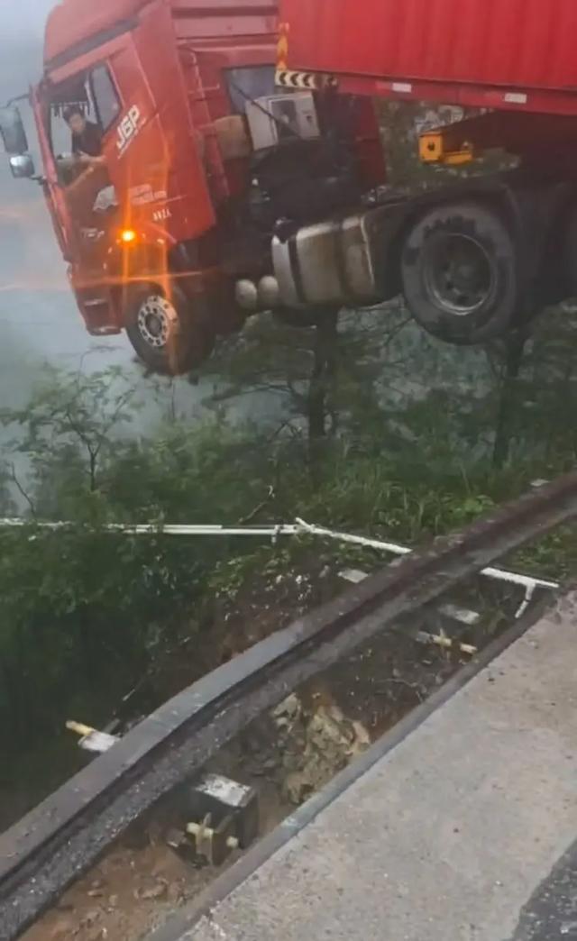 有视频显示,一红色货车车头已经腾空,车身还留在路面,货车司机尚待在车头。路上的人对司机喊“你命大啊危险啊!只能等消防来啊!没信号!”并称下方已经有两辆小车掉落。司机劝该路人不要再往前,该路人随即发现路面有开裂,迅速往后撤。