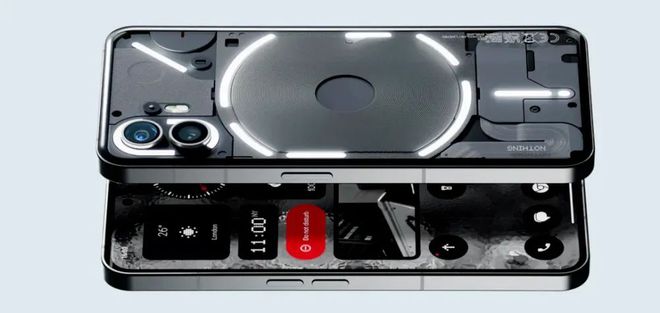 作为参考,前代Nothing Phone(2)手机提供白色、灰色两种配色可选,并且延续了前代的透明式后盖设计,而且还依然配备了带有灯带的Glyph无线充电线圈,不过分成了数小段。