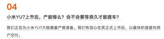 对于外界关心的小米YU7上市后的产能“吃紧”问题,小米汽车方面回应称,“我们正在为小米YU7大规模量产做准备。我们有信心在YU7正式上市后,以最快的速度向用户交付”。