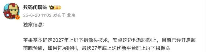 苹果基本确定2027年上屏下摄像头技术,安卓这边也想同期上,目前已经开启超前瞻预研,如果进展顺利,最快27年底上迭代新平台时上屏下摄像头。