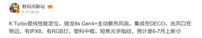 来自同一位博主的此前爆料显示,OPPO K 系列 Turbo 新机预计将于 6-7 月发布(有望命名为 OPPO K13 Turbo / Pro)。