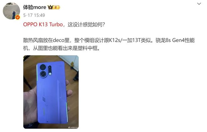 曝OPPO K13 Turbo系列手机7月发布,主动散热风扇设计