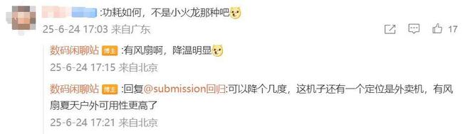 针对新机功耗、温控如何,他回复“有风扇啊,降温明显”“可以降个几度,这机子还有一个定位是外卖机,有风扇夏天户外可用性更高了”;