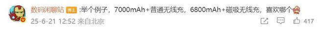 博主在评论区中列举了两个方案:“7000mAh + 普通无线充”和“6800mAh + 磁吸无线充”。