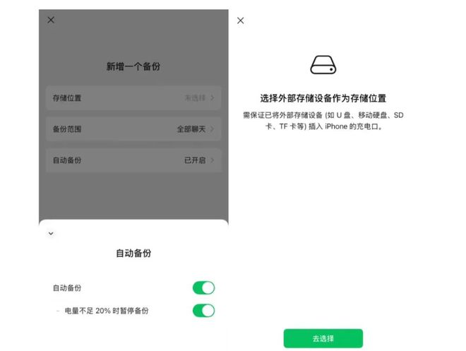 可以看到,与此前仅支持备份到电脑相比,新功能支持将聊天记录备份到外部存储设备:如U盘、移动硬盘等。