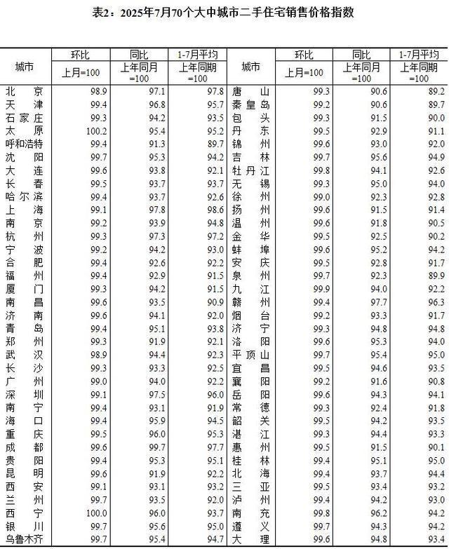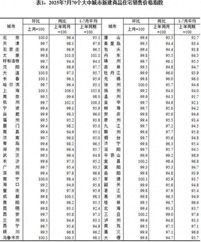 国家统计局8月15日公布了2025年7月份70个大中城市商品住宅销售价格变动情况。国家统计局城市司首席统计师王中华解读称,2025年7月份,70个大中城市中,各线城市商品住宅销售价格环比下降,同比降幅整体有所收窄。
