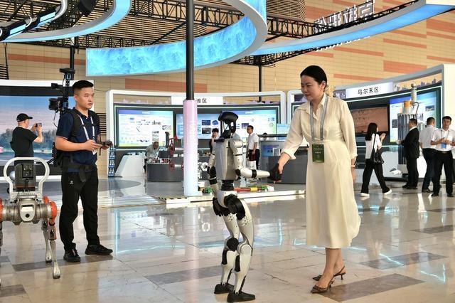 (8月13日 参展嘉宾与智能人形机器人握手 努尔夏提·尼加提 摄)