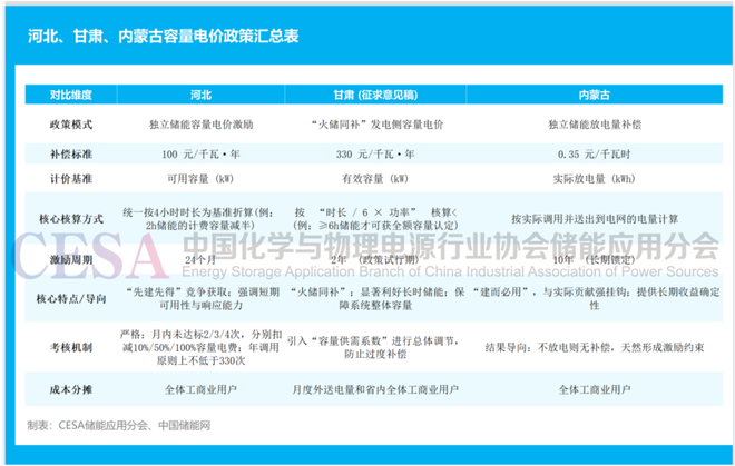 1.河北的“短期激励”模式:作为先行者,河北省对独立储能实施容量电价激励,其政策核心在于“短期”和“考核”,通过“先建先得”的方式提供100元/千瓦·年的容量电价,但激励期仅为24个月,并设置了严苛的考核机制。