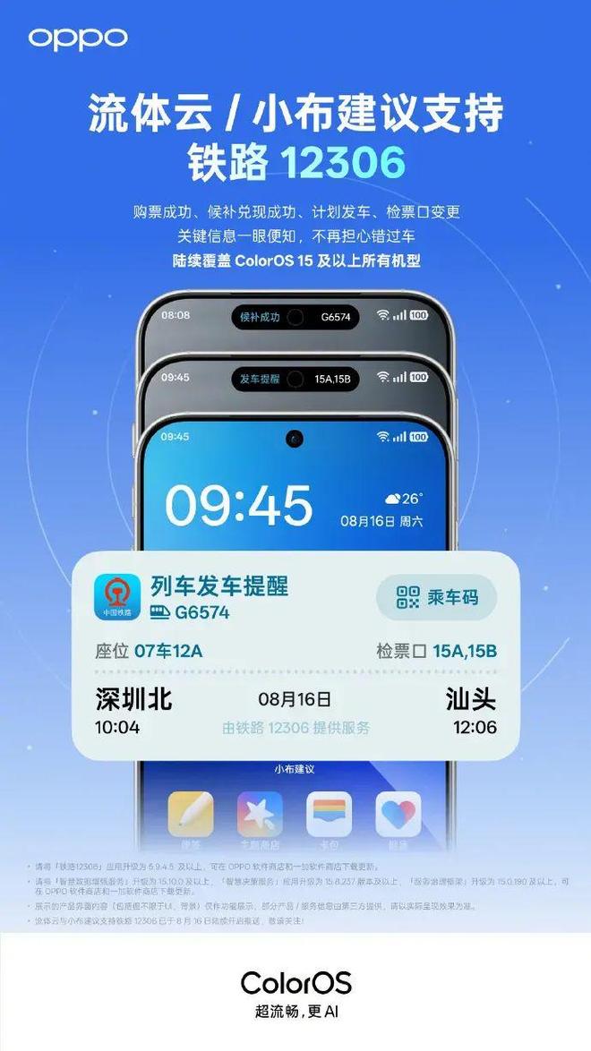 今日凌晨,ColorOS 官微发文宣布:流体云/小布建议现已支持铁路 12306,陆续覆盖搭载 ColorOS 15 及以上所有机型。在 OPPO手机上,一眼即可知悉高铁行程关键信息。
