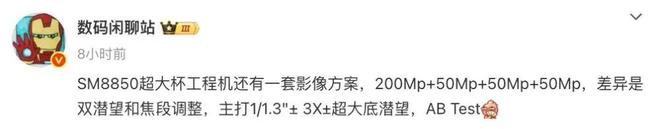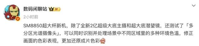 博主@数码闲聊站 发文透露,“SM8850超大杯新机,除了全新2亿超级大底主摄和超大底潜望镜,还测试了「多分区光谱摄像头」,可以同时识别并处理场景中不同区域里的多种环境色温,修正画面的色彩表现,更加还原成片色彩”。