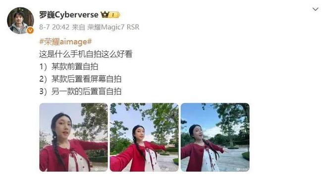 此前,荣耀首席影像工程师罗巍 Cyberverse发布了多组人像自拍对比照片,并表示它们分别来自某款前置自拍、某款后置看屏幕自拍、另一款的后置盲自拍。其中,后置看屏幕自拍应该就是荣耀 Magic V Flip2 的人像拍照样张。