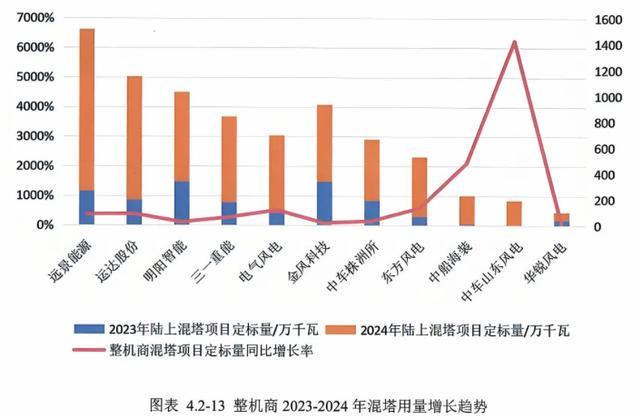 根据中国混凝土与水泥制品协会风电混塔分会统计,2024年国内陆上风电混塔项目定标量为6134.8万千瓦。其中,远景能源混塔项目定标量为1246.34万千瓦,占比20%,同比2023年增长超3倍,在11家采用混塔的整机商中位列第一。
