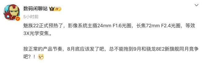 与此同时,博主@数码闲聊站 的爆料显示,“魅族22正式预热了,影像系统主摄24mm F1.6光圈,长焦72mm F2.4光圈,等效3X光学变焦。按正常的产品节奏,8月底应该发了吧,总不能拖到9月和骁龙8E2新旗舰同月竞争吧?!”