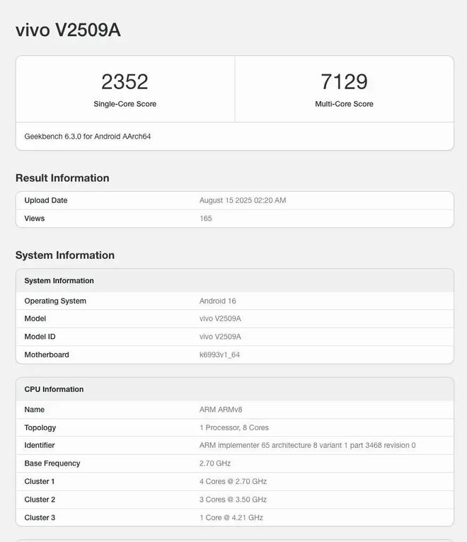 另外,一款型号为 vivo V2509A 的新机在此前现身了 Geekbench 跑分。