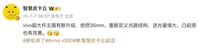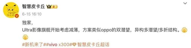 除了标准版本和Pro版本外,博主@智慧皮卡丘 最近的几份爆料中提到,“vivo超大杯主摄有新升级,依然35mm,重新定义光路结构,进光量增大,凸起感也有改善”“Ultra影像旗舰开始考虑减薄,方案类似oppo的双潜望,异构多潜望/多折结构”等信息。